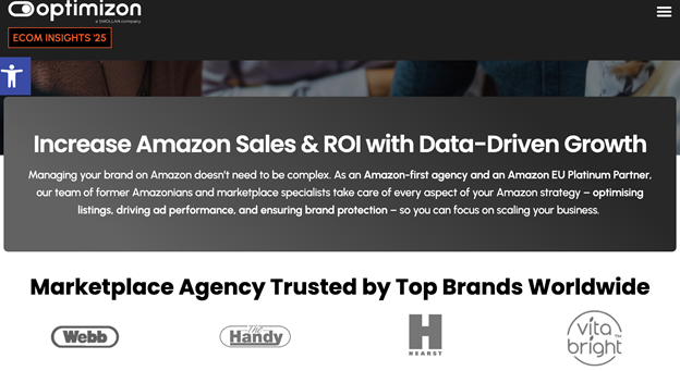Optimizon is one of the UK’s leading Amazon brand optimization agencies. Their team boasts over 60+ years of combined experience in Amazon marketing and advertising. They handle everything from account strategy to brand protection and compliance. Their goal is to help you maximise sales while staying in full control.
