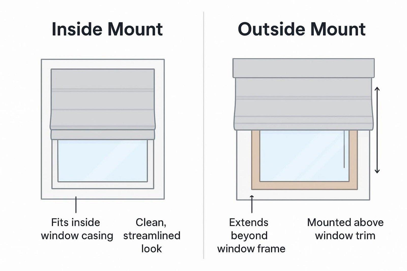 Inside mounts sit inside the frame for a neat, low-profile look. Measure in three places and use the smallest width and shortest height so the shade fits without rubbing. Outside mounts sit on the wall or trim. Add extra width and height to block light and hide frame flaws. This is helpful if the frame is too shallow for an inside mount.