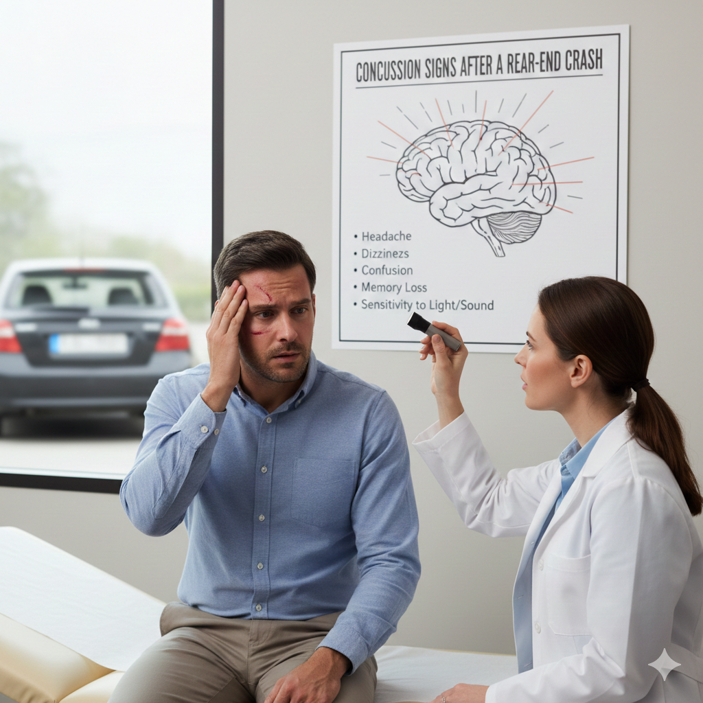 One of the biggest mistakes after a rear-end crash is assuming that no immediate symptoms mean no injury. Concussion symptoms frequently appear 24 to 72 hours later, once adrenaline wears off and inflammation develops.