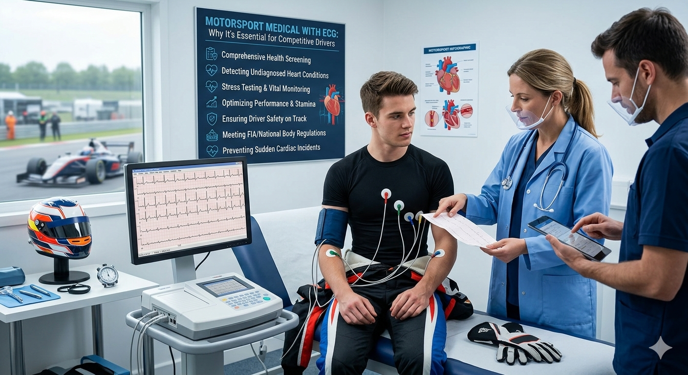 A motorsport medical with ECG is a comprehensive health assessment designed specifically for drivers involved in competitive motorsports. Unlike standard medical exams, it focuses on evaluating the cardiovascular and neurological fitness required to drive at high speeds safely.